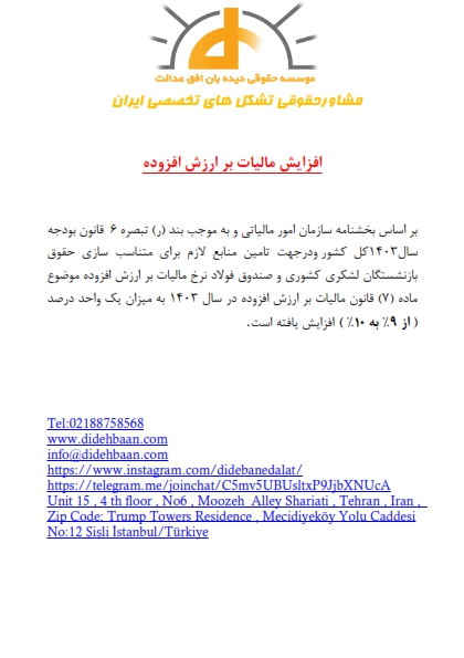 بر اساس بخشنامه سازمان امور مالیاتی و به موجب بند (ر) تبصره ۶  قانون بودجه سال۱۴۰3کل کشور ودرجهت تامین منابع لازم برای متناسب سازی حقوق بازنشستگان لشکری کشوری و صندوق فولاد نرخ مالیات بر ارزش افزوده موضوع ماده (۷) قانون مالیات بر ارزش افزوده در سال ۱۴۰۳ به میزان یک واحد درصد ( از ۹% به ۱۰% ) افزایش یافته است.