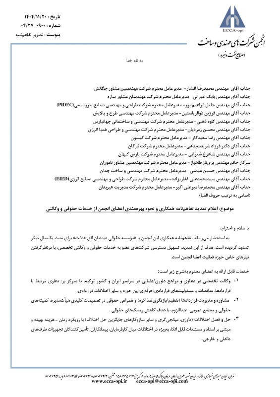به‌موجب این تمدیدنامه ، مؤسسه به اعضای انجمن ، در زمینه های تنظیم/ بازنگری قراردادها، مدیریت دعاوی و داوری، و پایش مقررات مشاوره حقوقی تخصصی ارائه می‌ نماید.